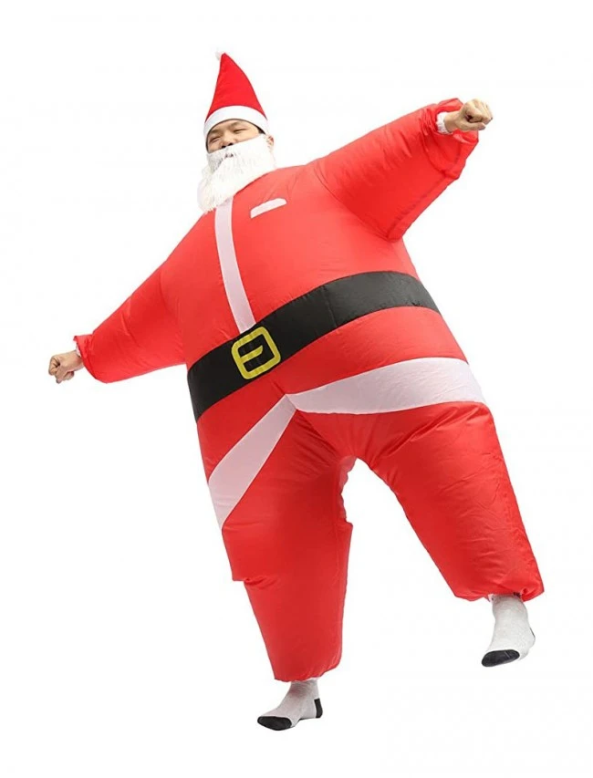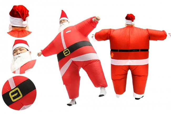 Santa air-filled costume is available with a santa bodysuit. The package includes 2 battery-operated fans further. The fans are inside the outfit. A false white beard is there. Also, get a large pointy red hat.