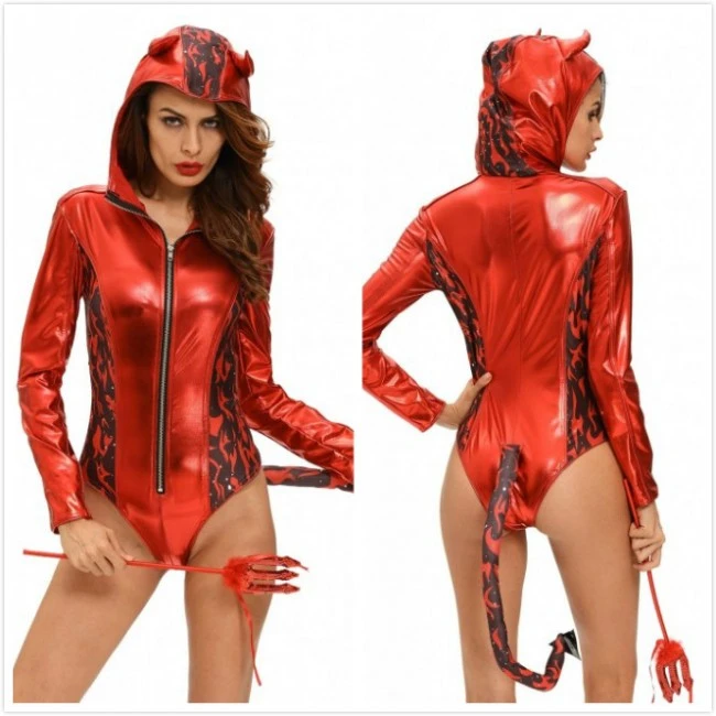 Release your inner devil by wearing this sassy two-piece Red Hot Devilish Hooded Romper Costume which includes devil fork. It features a faux leather romper, front zipper and it’s hooded, long sleeved, eye-catching print on both sides, hood center and long tail. Your devilish naughty demeanor will be irresistible to many and surely provide for some after party fun, frolic and entertainment with that special devil you have captured.
