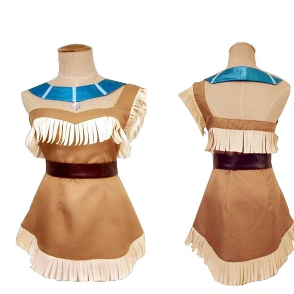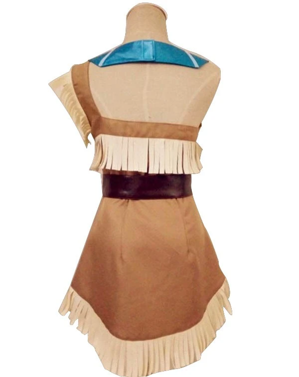 - This beautiful Native American-inspired costume is a faux suede dress featuring light cream color fringes and the trademark blue necklace with a leaf pendant puts a finishing touch on this historically-inspired costume.