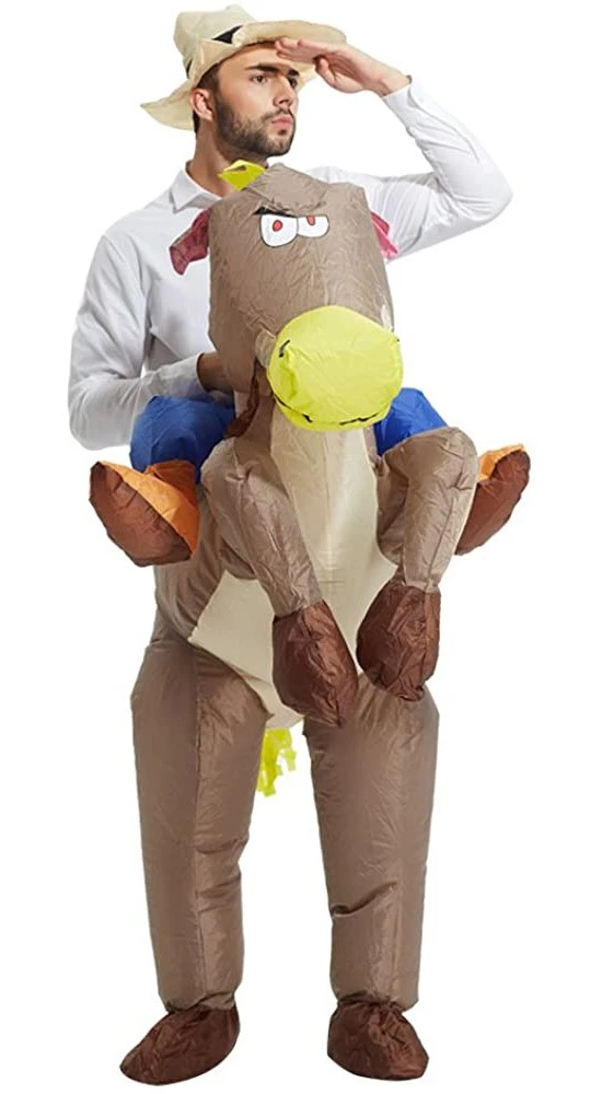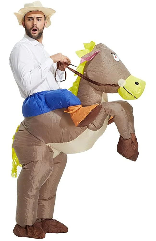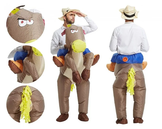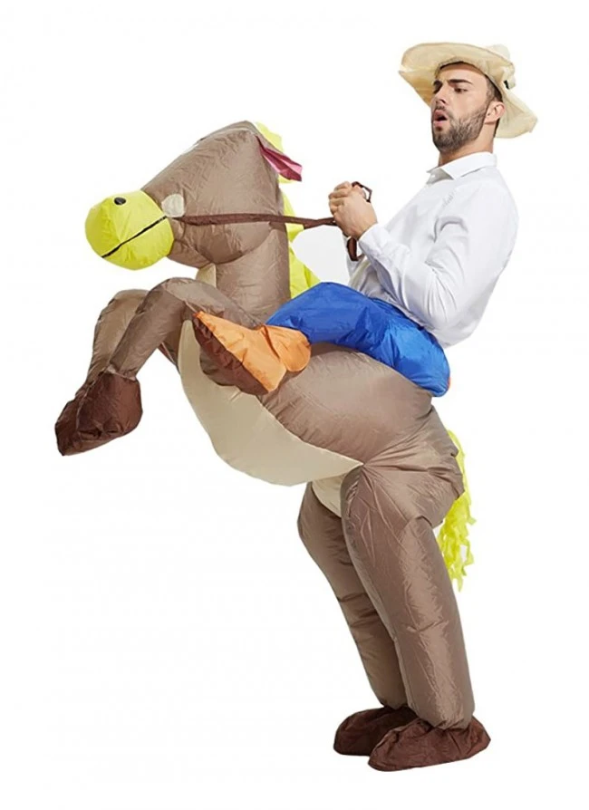 An Inflatable Costume inflates around the wearer. Battery-powered blowers or fan cause this inflation. The fan pulls in the air inside the costume. It helps to make the user look like a giant. If it is of a horse then it looks like a giant horse. Adult female horses are mare. Three years old female horses and younger ones are Filly. A young male horse is Colt. Adult ones are Stallion. Their life expectancy is 25-30 years. Isolated horses become hard to manage. Anyone dressed likeacowboy riding horsealso will attract attention. If not then it will ruin your mood. We will not let that happen. Horses run shortly after birth. It has enormous energy. Horses gallop at about 44 kph or 27 mph. If you feel that adrenaline rush inside you then the costume portrays you the best.