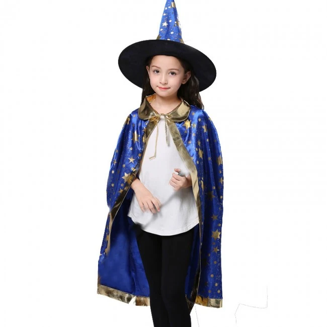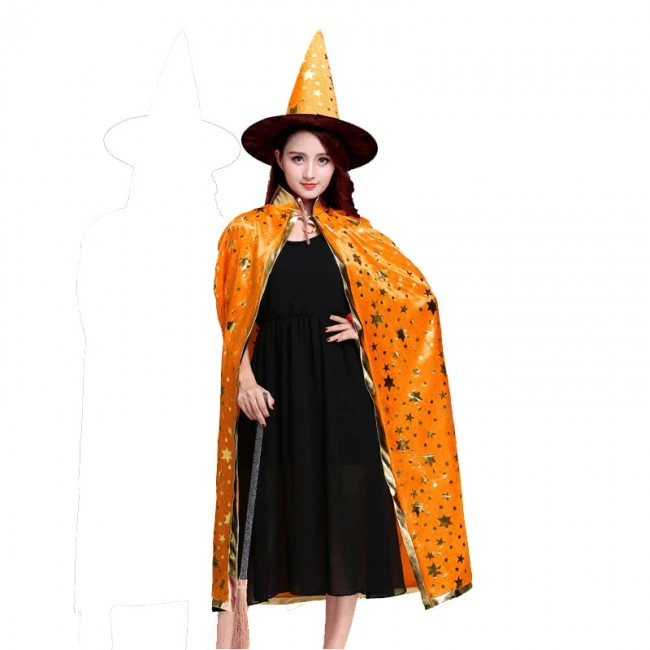 The most popular witch style is the witch hat characterized by a broad brim and the conical tip. The Halloween Magic Witch Cosplay costume package consists of a cloak and a pointy hat. The cloak is deep blue. The borderline running along the edges of the cloak and also the extended collar part is in golden color. A glossy finishing touch gives a satin-smooth feel to the cloak. The entire cloak bears star and circle patterns designed in golden color. There is a pair of small strap-like string that helps to tie the cloak around the neck part.