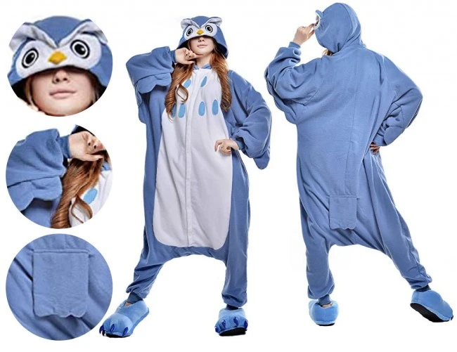 The overall dress has. Made of high-stretch textile material. Warm and comfortable. Will not make you feel itchy. And easy to put on. The zipper design is smart. It’s a nightgown you should keep in your closet. The entire garment is very generous, even if you are overweight can be completely in. If you like this owl pajamas. Hurry up and order it.