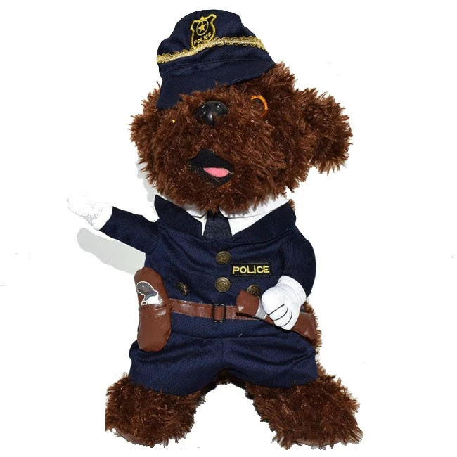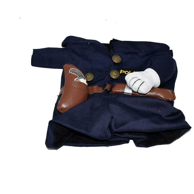 - The funny dog costume features a blue shirt decorated to look like a police uniform.