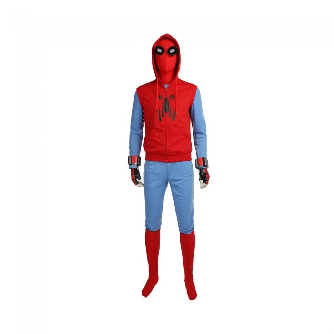 This handmade costume is first seen in Captain America: Civil War. Later, in Spider—Man: Homecoming. As its name suggests, Peter Parker himself made this suit whatever resources he got. The suit consists of a red sleeveless hoodie with a small black spider-emblem at its center. It also has a blue sweat suit underneath and a pair of fingerless gloves. The gloves are black and red combine.