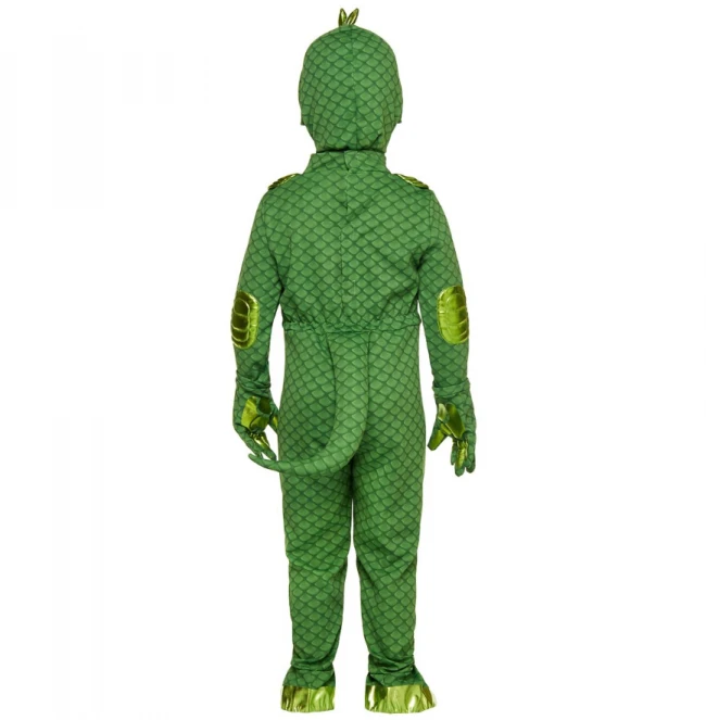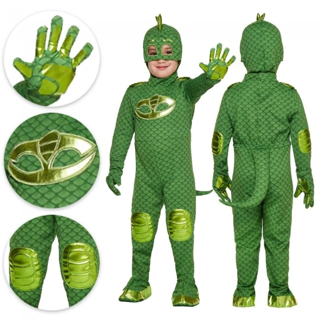 Pj masks Gekko has a thick reptilian tail at the back. This tail shows the inspiration from a lizard. The tail also has the same reptilian pattern as the whole body. Our toddler Gekko costume also has a thick tail that stands in the air. The tail of Gekko does not touch the ground, the same is the case with the tail of our costume. It comes out from the back and stays in the air.